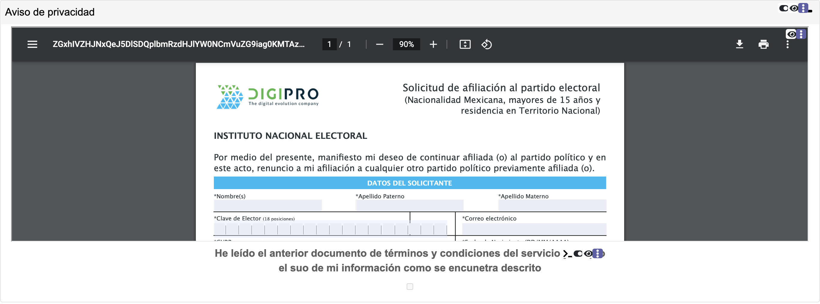 Hay diferentes formas de como mostrar un texto relacionado con términos y condiciones, aviso de privacidad o contratos. Esta es una de las formas de mostrar un documento para que el usuario pueda aceptar el modo en que se va a utilizar los datos recabados u otros temas.