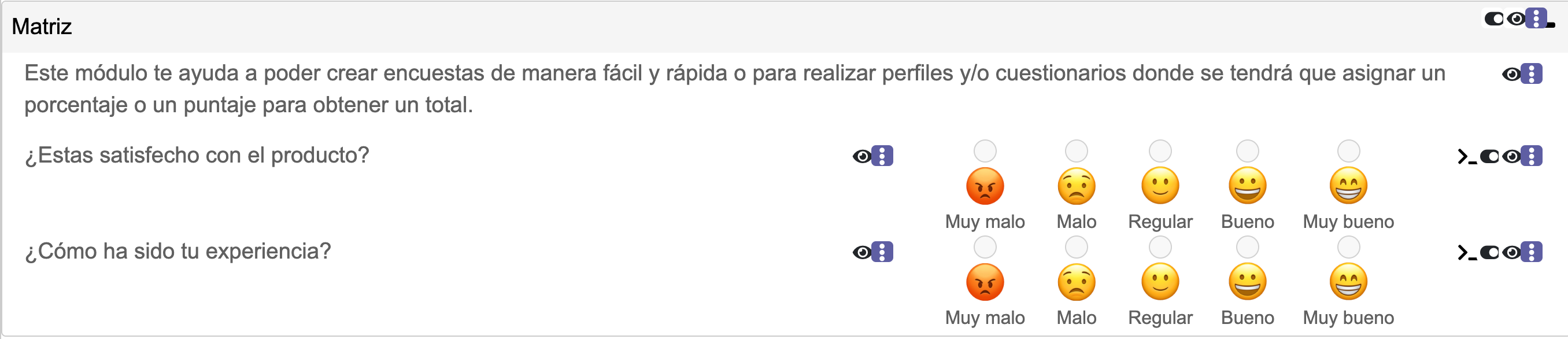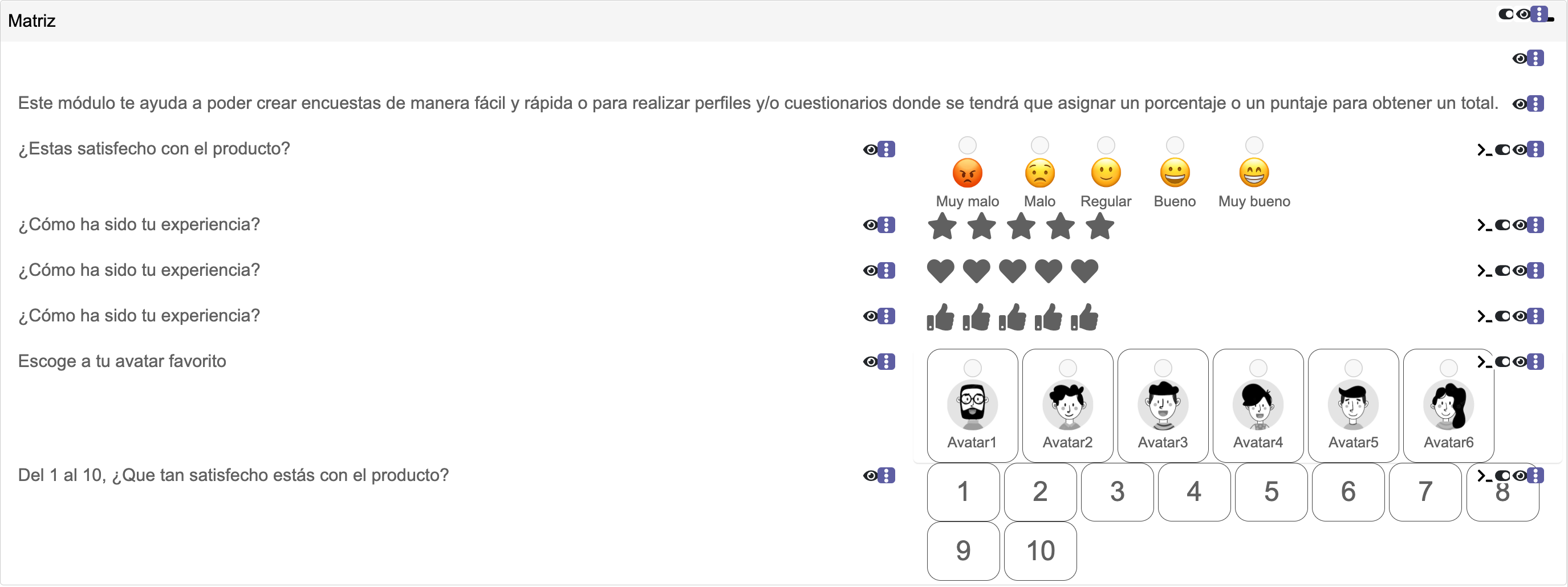 Matriz de preguntas y opciones de respuestas, este módulo se enfoca en poder representar las opciones en diferentes formas para mejorar la experiencia de usuario.