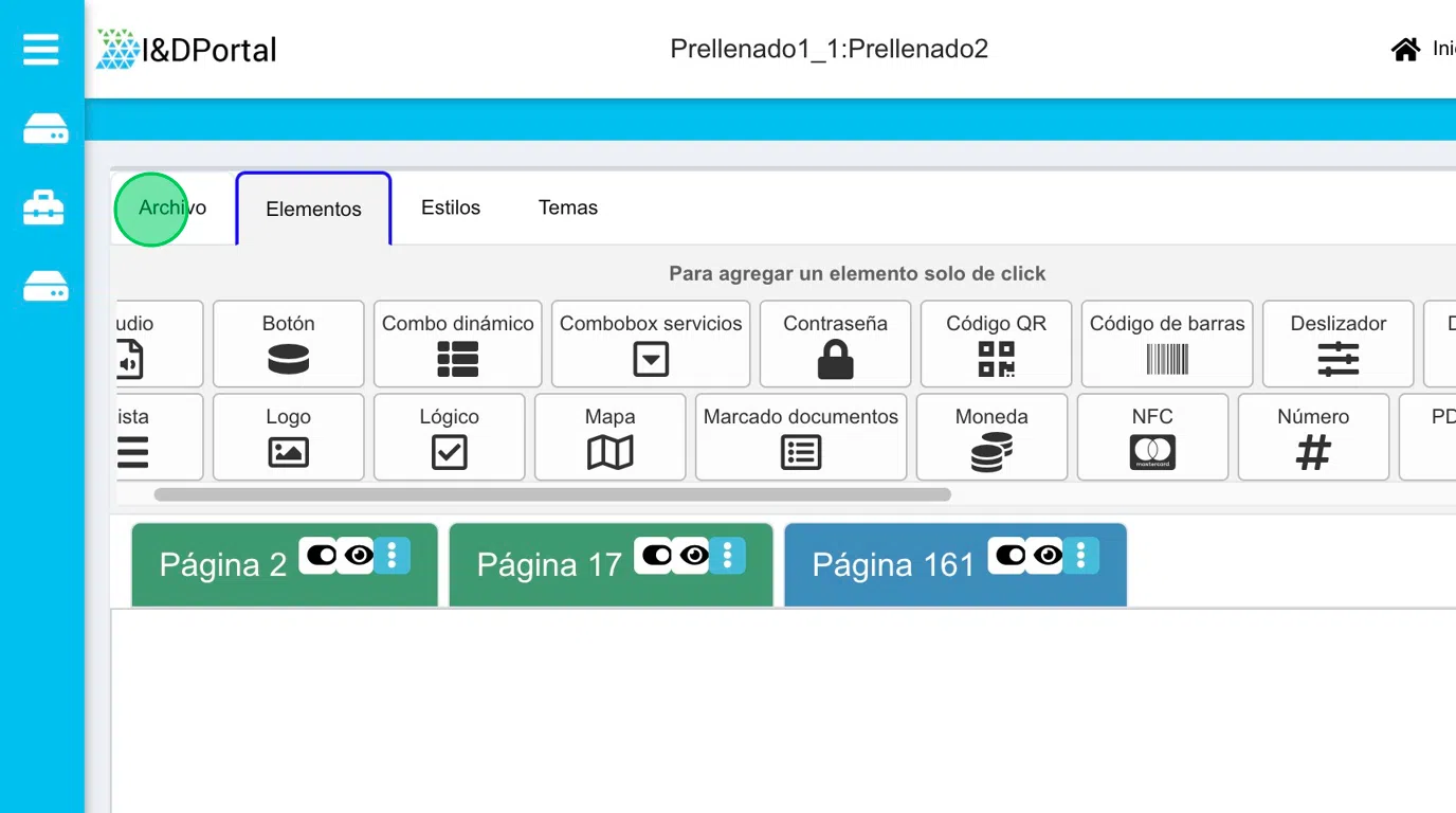 1. Damos clic en la pesta帽a Elementos y se agregan 3 elementos de tipo Texto Lineal y 1 elemento de tipo Bot贸n.