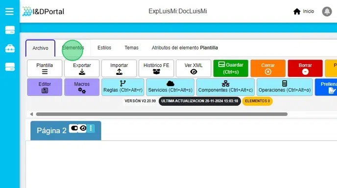 - Damos clic en la pestaña Elementos y se agregan 1 elemento de tipo Texto Lineal, 1 elemento de tipo Texto Multilíneas, 1 elemento de tipo Botón y 1 elemento de tipo Wizard.
