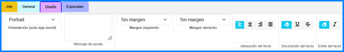 Estos se dividen en 4 grupos: Info, General, Diseño y Especiales.