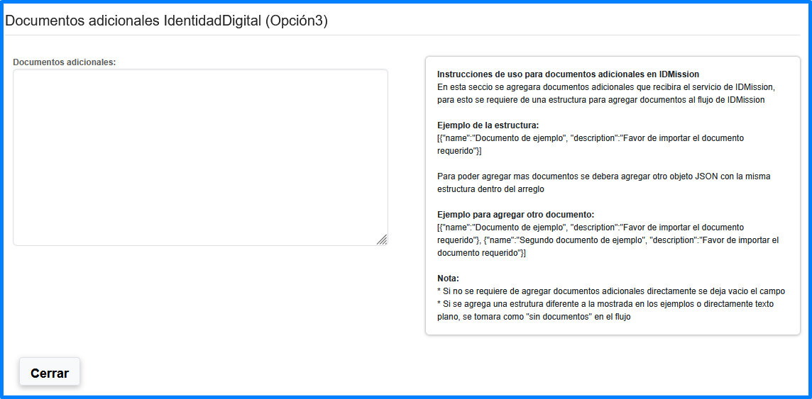 El servicio de IdentidadDigital (Opción3) permite agregar documetos adicionales, estos documentos se pueden configurar dentro del modal "Documentos Adicionales".