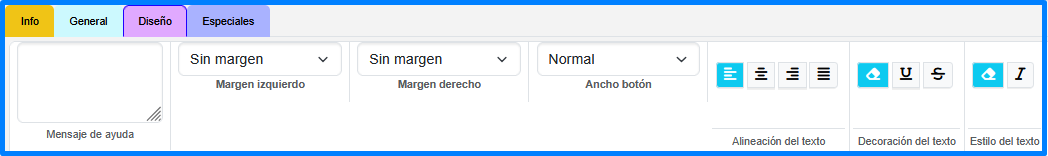 Esta pestaña permite cambiar el diseño del elemento, desde cambiar los colores hasta agregar mensajes de ayuda al usuario: