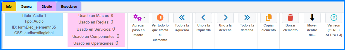 | Botón que mueve el elemento de lugar: Todo a la Izquierda: mueve el elemento al comienzo de la página, Uno a la Izquierda: mueve el elemento a la izquierda, Uno a la Derecha: mueve el elemento a la derecha y Todo a la Derecha: mueve el elemento al final de la página. | |