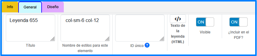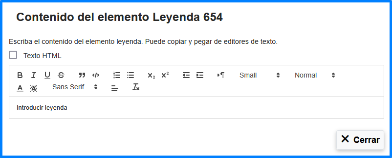 - Sin Texto HTML: al no tener el check seleccionado el elemento permite ingresar la Leyenda de forma. manual, provee al usuario de las herramientas para colocar tamaños de texto, colores, títulos y espaciados así como decoración en el texto como Negritas, cursiva o subrayado.