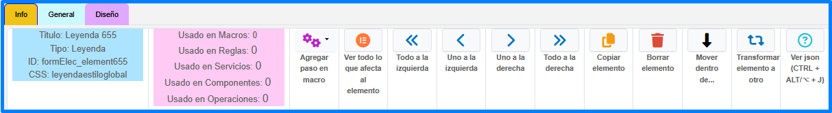 | Botón que mueve el elemento de lugar: Todo a la Izquierda: mueve el elemento al comienzo de la página, Uno a la Izquierda: mueve el elemento a la izquierda, Uno a la Derecha: mueve el elemento a la derecha y Todo a la Derecha: mueve el elemento al final de la página. | |