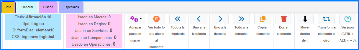 Esta pestaña muestra las funciones especiales del elemento.