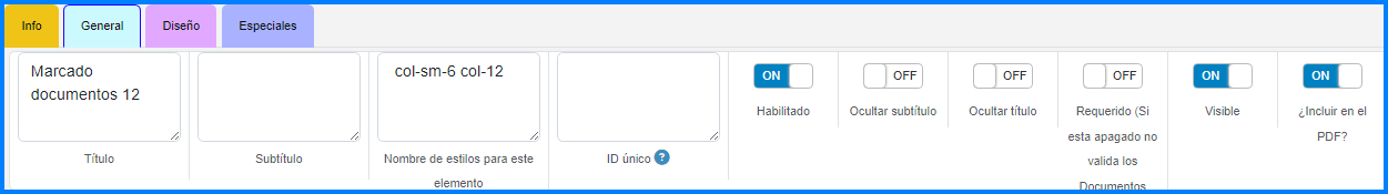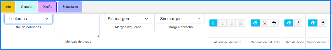 Estos se dividen en 4 grupos: Info, General, Diseño y Especiales.