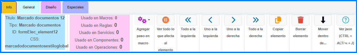 | Botón que mueve el elemento de lugar: Todo a la Izquierda: mueve el elemento al comienzo de la página, Uno a la Izquierda: mueve el elemento a la izquierda, Uno a la Derecha: mueve el elemento a la derecha y Todo a la Derecha: mueve el elemento al final de la página. | |