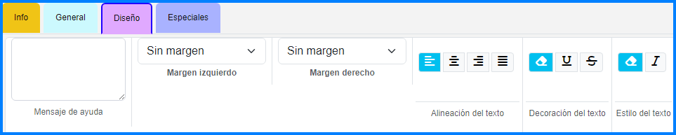 Esta pestaña permite cambiar el diseño del elemento, desde cambiar los colores hasta agregar mensajes de ayuda al usuario: