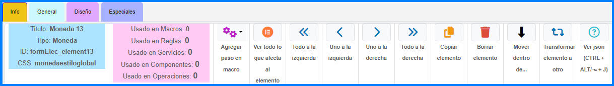 Estos se dividen en 4 grupos: Info, General, Diseño y Especiales.