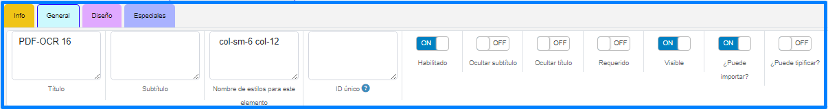 - PDF-OCR: Escanea el PDF y permite colocar el resultado en los elementos Texto Lineal o Texto Multilíneas que el usuario tenga configurados en el Formato Electrónico.
