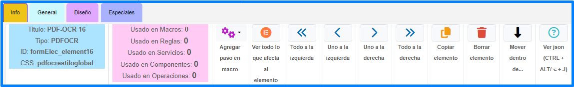| Botón que mueve el elemento de lugar: Todo a la Izquierda: mueve el elemento al comienzo de la página, Uno a la Izquierda: mueve el elemento a la izquierda, Uno a la Derecha: mueve el elemento a la derecha y Todo a la Derecha: mueve el elemento al final de la página. | |