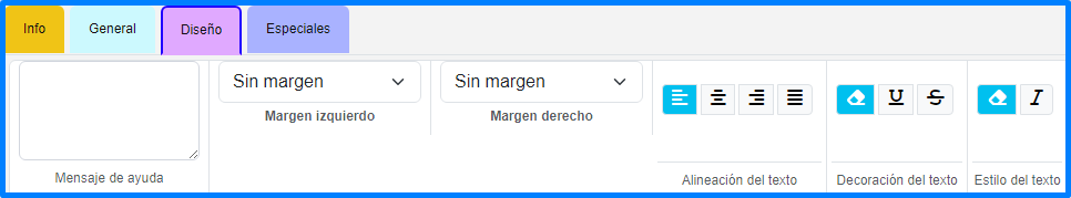 Esta pestaña permite cambiar el diseño del elemento, desde cambiar los colores hasta agregar mensajes de ayuda al usuario: