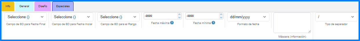 Estos se dividen en 4 grupos: Info, General, Diseño y Especiales.