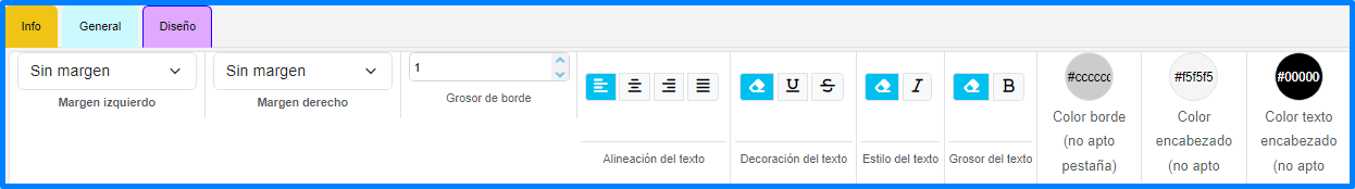 Estos se dividen en 4 grupos: Info, General, Diseño y Especiales.