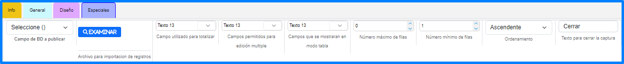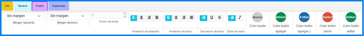 Estos se dividen en 4 grupos: Info, General, Diseño y Especiales.