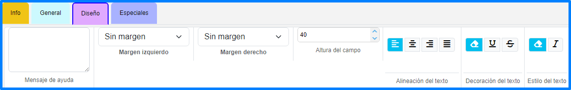 Esta pestaña permite cambiar el diseño del elemento, desde cambiar los colores hasta agregar mensajes de ayuda al usuario: