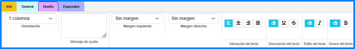 Esta pestaña permite cambiar el diseño del elemento, desde cambiar los colores hasta agregar mensajes de ayuda al usuario: