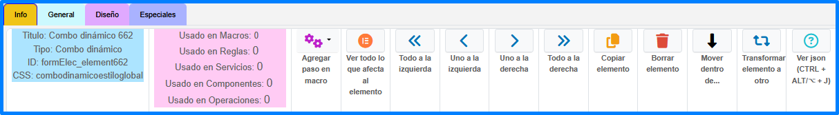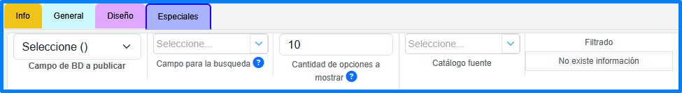 Estos se dividen en 4 grupos: Info, General, Diseño y Especiales.