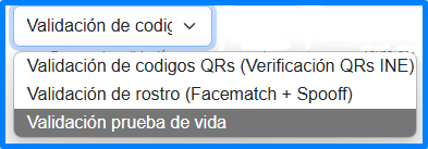 Para realizar la "Validaci贸n de rostro (Facematch + Spoof)", es necesario realizar primeramente la captura de los QRs de la INE, para poder proceder con la validaci贸n mediante la toma de la selfie. Una vez seleccionada esta configuraci贸n, se deber谩 pulsar el bot贸n para realizar la captura de la "Validaci贸n de rostro", la cual tomar谩 2 fotograf铆as: una de lejos y otra de cerca. Esto nos devolver谩 un puntaje (score) con el resultado de la comprobaci贸n de los datos capturados de la INE y la toma de la selfie: